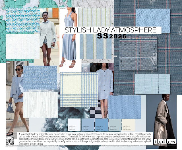 La t endenze colori e tessuti per abbigliamento donna Primavera/Estate 2026 di  Italtex è la tendenza che fornisce informazioni complete sui tessuti della stagione, partendo dalle fibre più importanti, passando ai colori, presentati con  codici  Pantone®, per arrivare  alle costruzioni di tessuti a maglia e tessuti ortogonali, ai  disegni e ai finissaggi. Inoltre, include immagini di nuovi capi in tendenza che ne suggeriscono l'uso. STYLISH LADY ATMOSPHERE Uno stile fatto di rigature semplici e pulite su doppio jersey jacquard impreziosite da un tocco di oro, da abbinare a leggere costine avorio in morbido modal e a tweed fantasia in azzurro e bianco panna. Tessuti crêpe di lana con semplici quadri da indossare con camicette goffrate in creponne di cotone. Un azzurro polveroso colora stuoie tweed con filati elaborati e lana granité, che creano un look elegante. Tonalità azzurre anche per la garze giro inglese in filato cordonetto da abbinare a quadri classici ri...